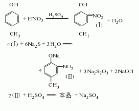 邻硝基对甲苯酚用硫化碱或催化加氢还原而得。从对甲苯酚硝化出发原料消耗定额:对甲苯酚工业品963kg/t、硝酸(96%)661kg/t、硫酸(92.5%)2127kg/t、硫化碱(60%)2425kg/t、纯碱20kg/t。